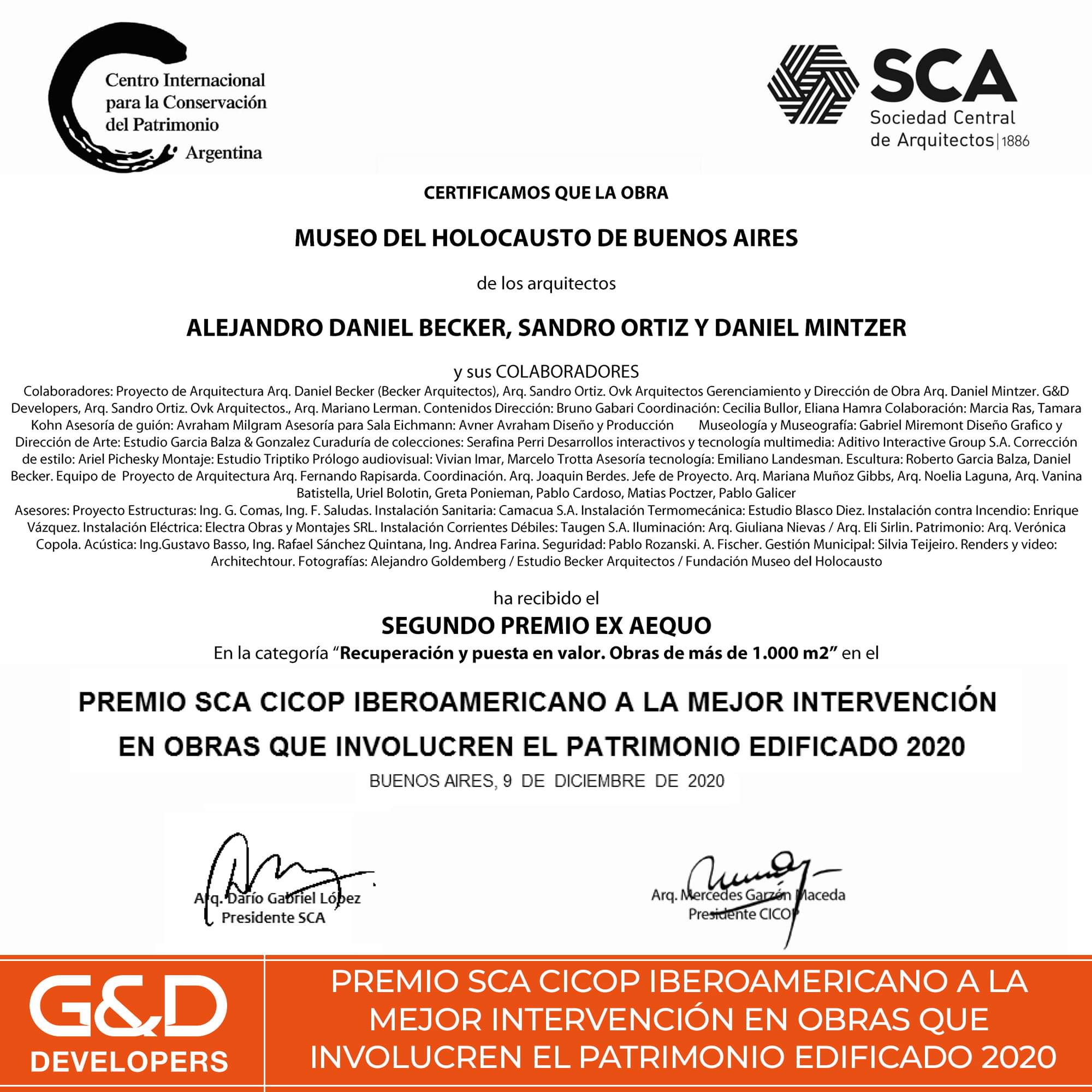 Recibimos por la Obra Museo del Holocausto el Segundo premio Ex AEQUO en la Categoría ¨Recuperación y puesta en valor. Obras de más de 1.000mts2.¨ Premio SCA CICOP Iberoamericano a la mejor Intervención en Obras que involucren el Patrimonio Edificado 2020.